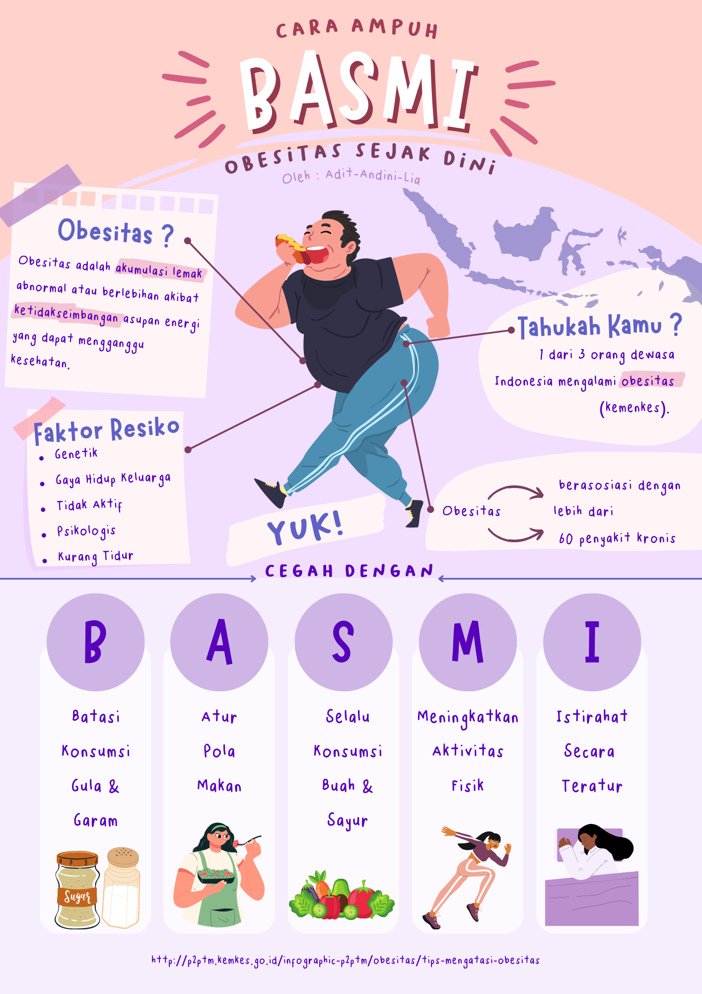 Pada penugasan Poster magang pubit BEM kali ini, kelompok 2 mengangkat tema “menjaga pola makan dalam mencegah obesitas” . Poster ini dibuat agar dapat memberikan insight kepada masyarakat mengenai upaya preventif pencegahan obesitas dengan BASMI.